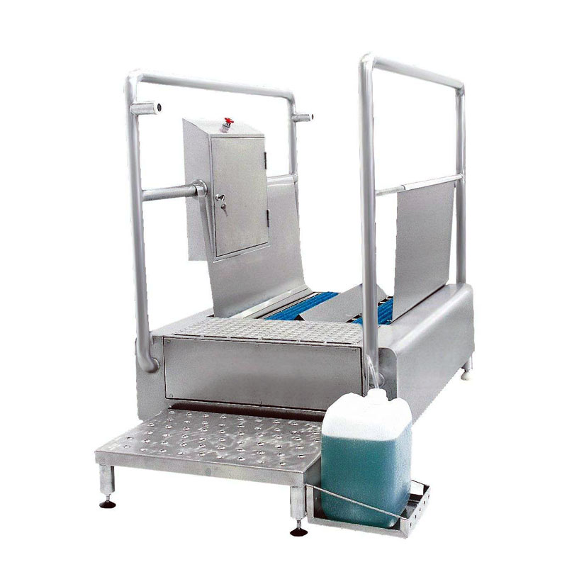 Durch Zwangsführung kontrollierte Desinfektion der Schuh- und Stiefelsohlen im Durchlaufverfahren.