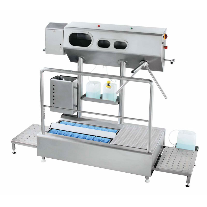 Während des gesamten Desinfektionsvorgangs bewegt sich der Benutzer auf einem Gitterrost, durch den die Nylonborsten des Sohlenreinigers ragen. Wenn ein Mitarbeiter die Hygieneschleuse betritt, wird der Durchlaufsohlenreiniger per Sensor automatisch ausgelöst. Durch die Rotation der Rundbürsten und der automatischen Zuführung von Desinfektionsmittel werden die Sohlen der Schuhe, Stiefel und Clogs gründlich gereinigt und desinfiziert. Auch beim Verlassen der Produktionsanlagen werden die Schuh- und Stiefelsohlen erneut gründlich gereinigt. Hierbei wird das Drehkreuz durch einen Sensor automatisch entsperrt, ohne dass die Hände erneut gereinigt werden müssen.