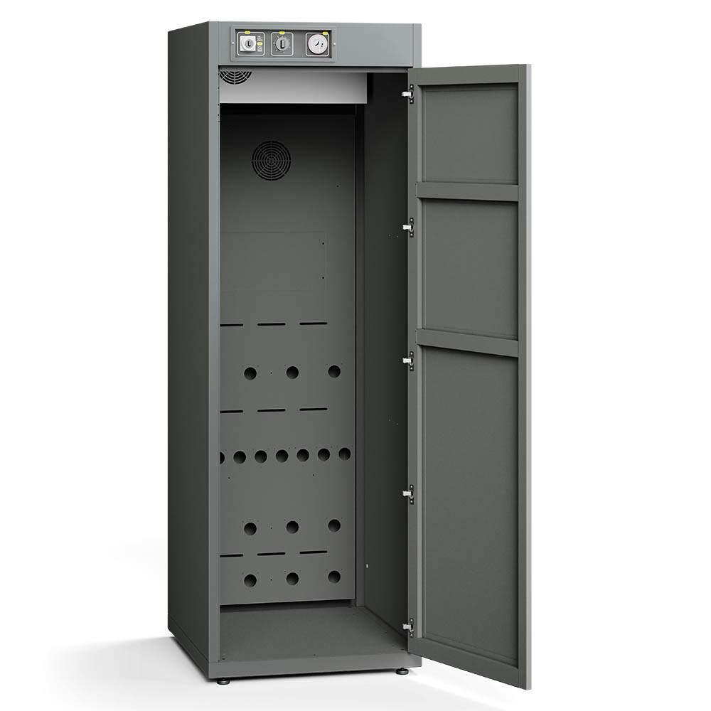 Im Schrankinneren lassen sich 4 vollständige Ausrüstungen gleichzeitig unterbringen. Jacken und Hosen werden an der Kleiderstange aufgehängt, während Schuhe und Handschuhe über Düsen gezielt von innen getrocknet werden. Dazu stehen 4 Paar ausblasbare Schuhdüsen (2x 480 mm, 2x 350 mm) und 4 Paar Handschuhdüsen (220 mm) zur Verfügung. Ergänzt wird es durch 8 Halter an der Türinnenseite für weitere Gegenstände. Der Trockenschrank wird standardgemäss ohne Kleiderbügel geliefert. Passende Kleiderbügel Spezial sind jedoch separat als Zubehör erhältlich (siehe unten) und können je nach Bedarf flexibel ergänzt werden.