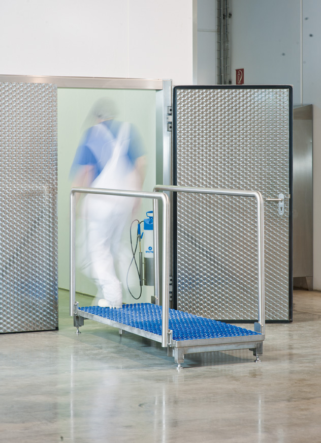 Um eine Verschleppung von Feuchtigkeit in andere Bereiche des Betriebes zu verhindern, empfehlen wir im Anschluss an die Sohlenreinigungsschleuse die Verwendung von stark wassersaugenden Fussmatten. Diese saugen die an den Sohlen haftende Feuchtigkeit ab und zeichnen sich durch eine grosse Aufnahmekapazität aus.