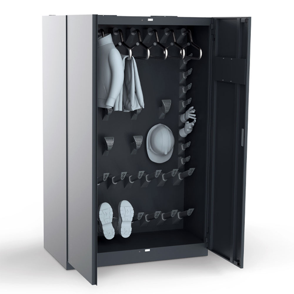 Dieser Trockenschrank bietet Platz für bis zu 8 vollständige Ausrüstungen, bestehend aus 8 Helmen, 16 Handschuhen, 16 Stiefeln oder Schuhen sowie 8 Kleidungsstücke. Das Gehäuse besteht aus sendzimirverzinktem Stahlblech und ist an den Ecken mehrfach vernietet. Stabile Scharniere aus verschweisstem Stahl sowie Magnetverschlüsse, Öffnungsbegrenzer und kleine Gumminoppen sorgen für ein leises Öffnen und Schliessen, besonders vorteilhaft in Umkleideräumen und Gemeinschaftsbereichen.