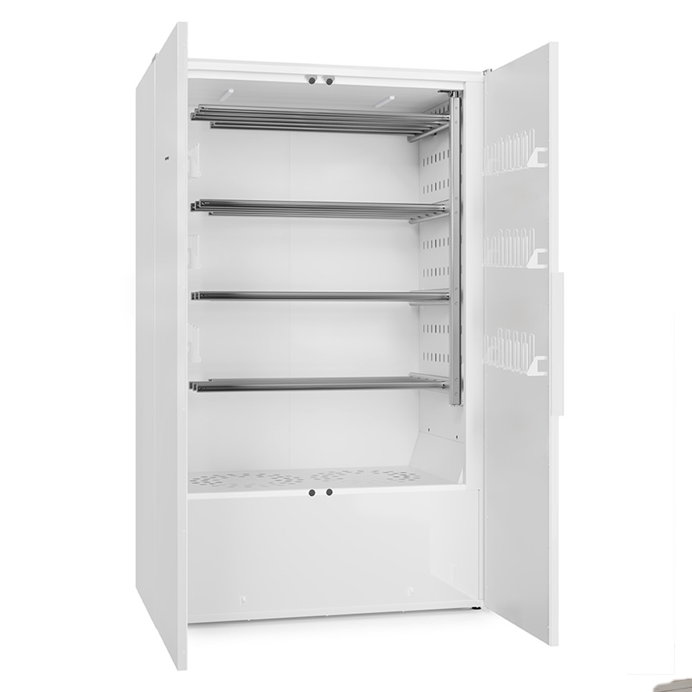 Die robuste Konstruktion aus pulverbeschichtetem, galvanisiertem Stahl ist langlebig, feuchtigkeitsbeständig und korrosionsgeschützt. Zur Ausstattung gehören 4 schwenkbare Kleiderbügel mit je 5 Edelstahlstangen, die wunschgemäss mit Kleidung, Wäsche, Badetücher, Bettwäsche etc. behängt werden können. Zusammen ergeben diese 20 ausfahrbaren Edelstahlarme eine Trockenlänge von insgesamt 18 Meter. Optional sind auf Anfrage Handschuhhalter für die Türinnenseiten erhältlich.