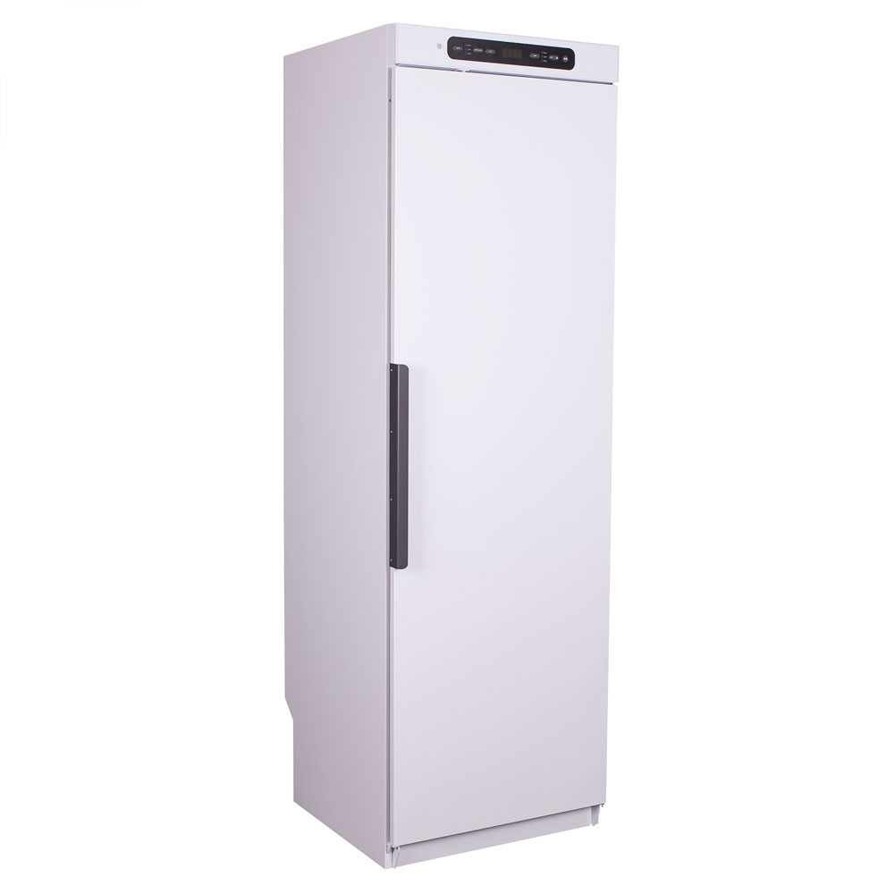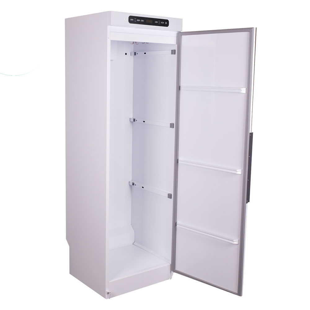 Dieser Trockenschrank ist durch den galvanisierten Stahl äusserst korrosionsbeständig und robust. Ideal für den langjährigen Einsatz in professionellen Betrieben. Neben der regelmässigen Reinigung ist der Schrank praktisch wartungsfrei. Die Türscharniere sind wahlweise links oder rechts montierbar (siehe Optionen). Die feuchte Luft wird über Öffnungen an der Schrankoberseite abgeführt.